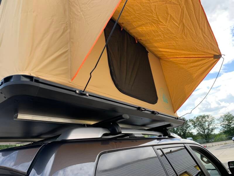 Smart Top 3, een opvallend mooi gevormde Hardtop daktent van het merk Rooftop Cabin en geliefd bij koppels die in hartelust erop uit trekken.